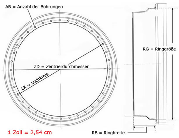 1. ZD = Zentrierduchmesser in mm 2. LK = Lochkreisdurchmesser in mm 3. AB = Anzahl der Bohrungen 4. RB = Ringbreite in Zoll 5. RG = Ringgröße in Zoll